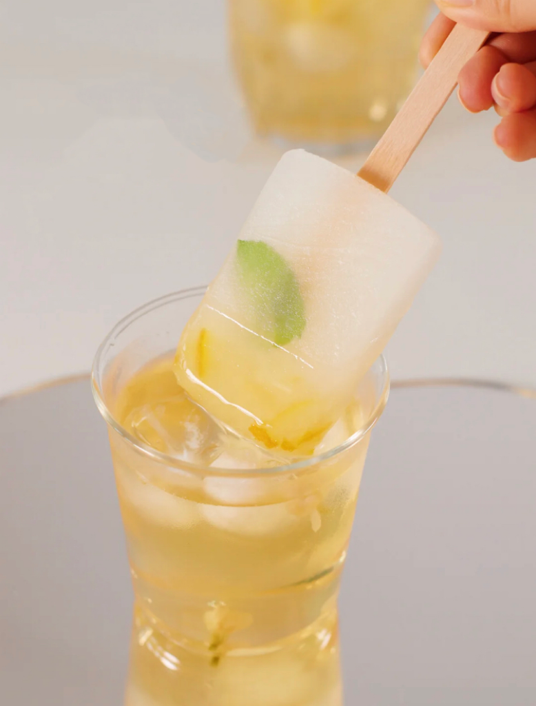 香草柚子冰棒:蜂蜜柚子茶 3大勺、香草糖漿 20g、水 600g、檸檬片、薄荷葉(可選)