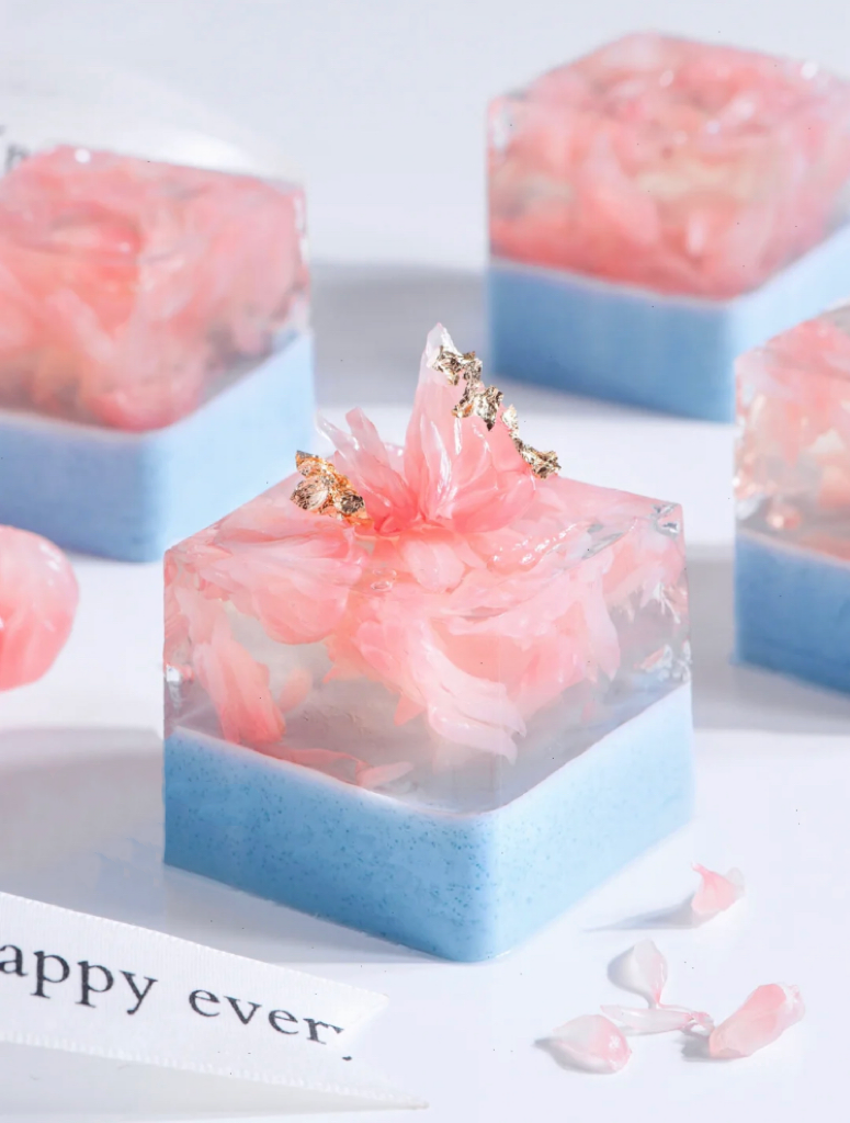 材料:紅心蜜柚適量、綠茶300g、白糖25g、白涼粉20g/藍色奶凍:牛奶200g、蝶豆花少許、白糖25g、白涼粉10g