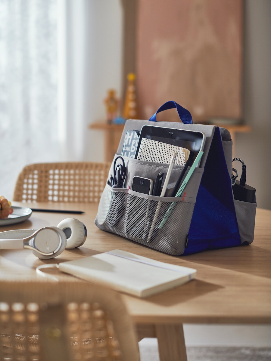 ÖVNING文具收納只需一提,就能來去自如,從臥房到客廳到哪裡都可以完整地作筆記,省去搬移時漏帶文具的煩惱,不同大小的夾層不只能收納文具,還能放進平板、書本等較大的物品,網型口袋方便清洗不易累積橡皮擦屑同時一眼就看到收納在內的小文具,方便拿取。