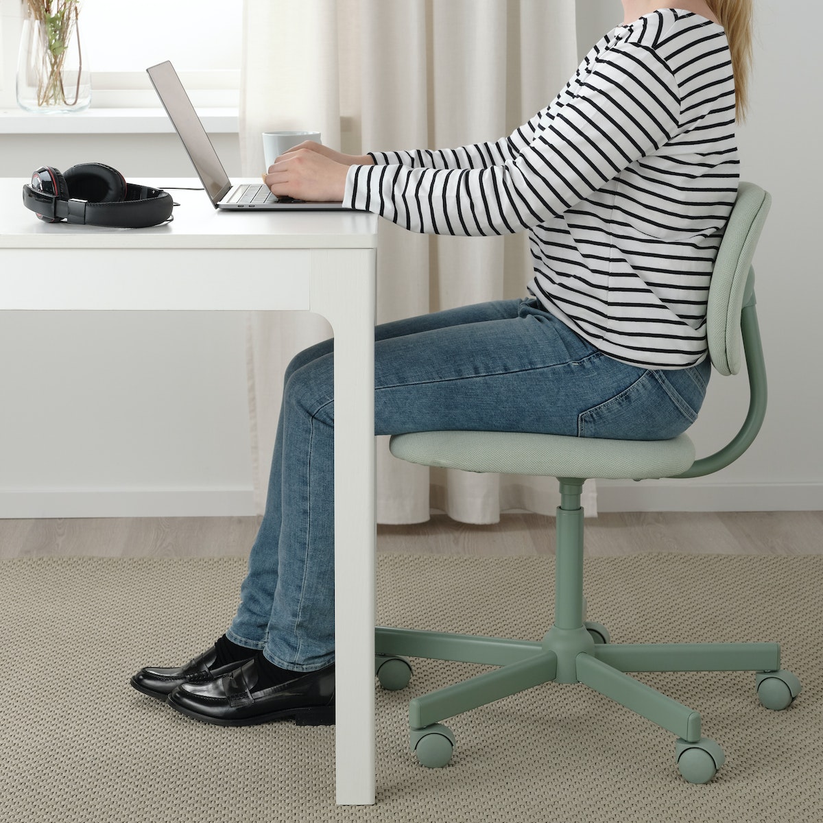 BLECKBERGET電腦椅寬大椅墊和椅背提供足夠的舒適度,同時省去了扶手設計,即使在狹小的空間也能擺放,外觀融合現代感造型,加上湖水綠的俏皮顏色,讓學習之於也能創造出專屬自我風格的空間。