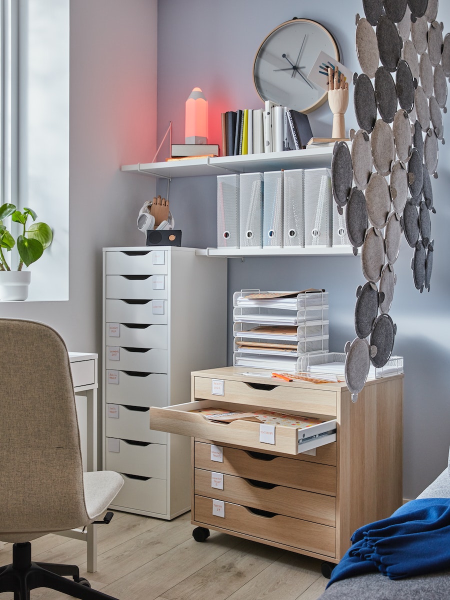 桌面的凌亂就交給ALEX抽屜櫃,附有不同高度的抽屜,能適應不同文具、書本或雜物尺寸,簡約的外型輕易與各種風格融合,更有美背式設計,隨意擺放在房間內任何地方都美觀,把常用而瑣碎的物件收進抽屜,還給桌面更多工作空間。