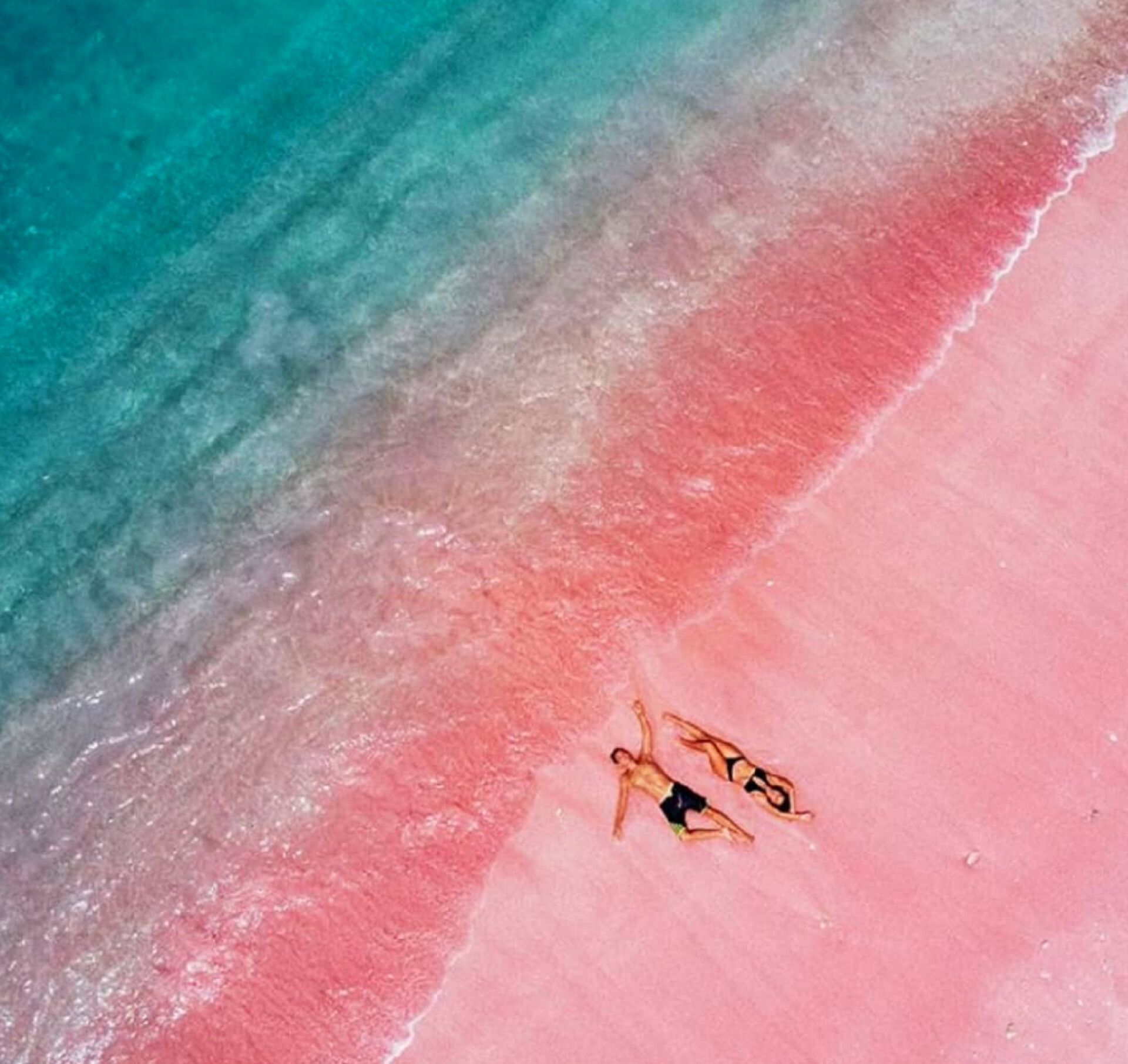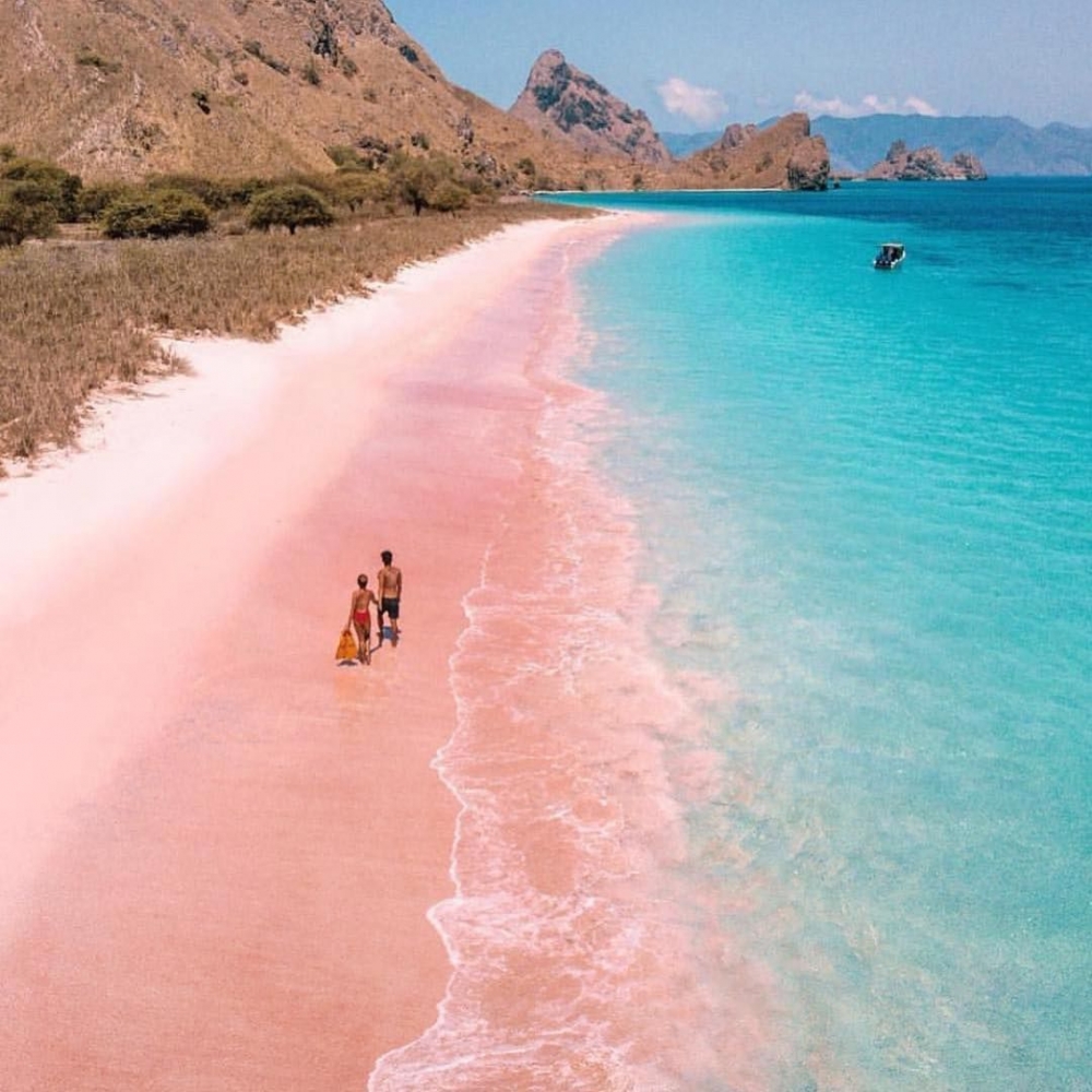 印尼除了擁有全世界最知名的渡假勝地『巴里島Bail』外,Pulau Komodo也因為擁有特殊的粉紅色海灘而爆紅,讓原本人煙稀少的它,成為最新亞洲放鬆渡假勝地的新寵兒。這夢幻的粉紅色沙灘是由島上許多孔蟲(Foraminfera)所生成的紅色色素,將珊瑚染成粉紅色,珊瑚的碎屑日積月累與原來的白沙互相結合,進而出現了這一片有如仙境一般的粉紅沙灘。從遠處可以看到湛藍到淺藍、清澈的海水與粉紅沙灘接連成一片,如此絕美的漸層色讓人看了感到心曠神怡。