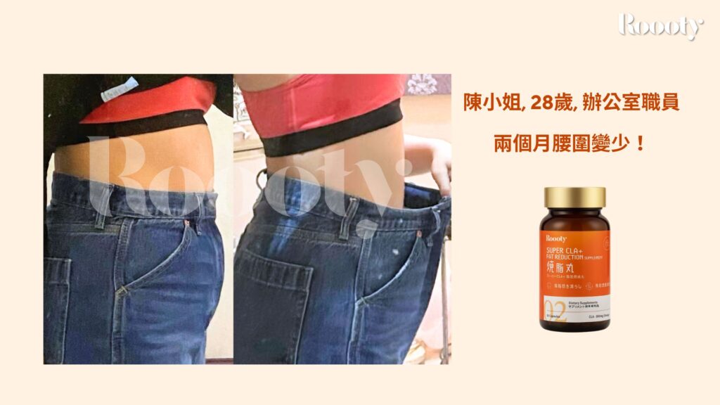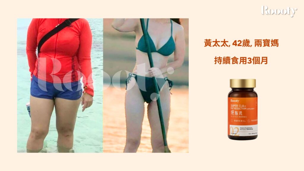 「生完小孩後新陳代謝真的變很慢。嘗試過很多產品都沒用。Roooty讓我印象最深的是『體力變好了』,而且沒有副作用。持續使用三個月後,產後一直減不掉的馬鞍肉終於消風,讓我重拾自信!」