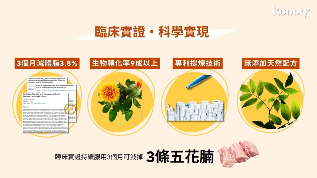 瞭解CLA的好處後,選擇「哪一種CLA」至關重要。普通CLA產品良莠不齊,吸收率是最大關鍵。而Roooty Super CLA+ 正是這場革命中的頂級答案,研究實證服用3個月有效減少3.8%體脂率!